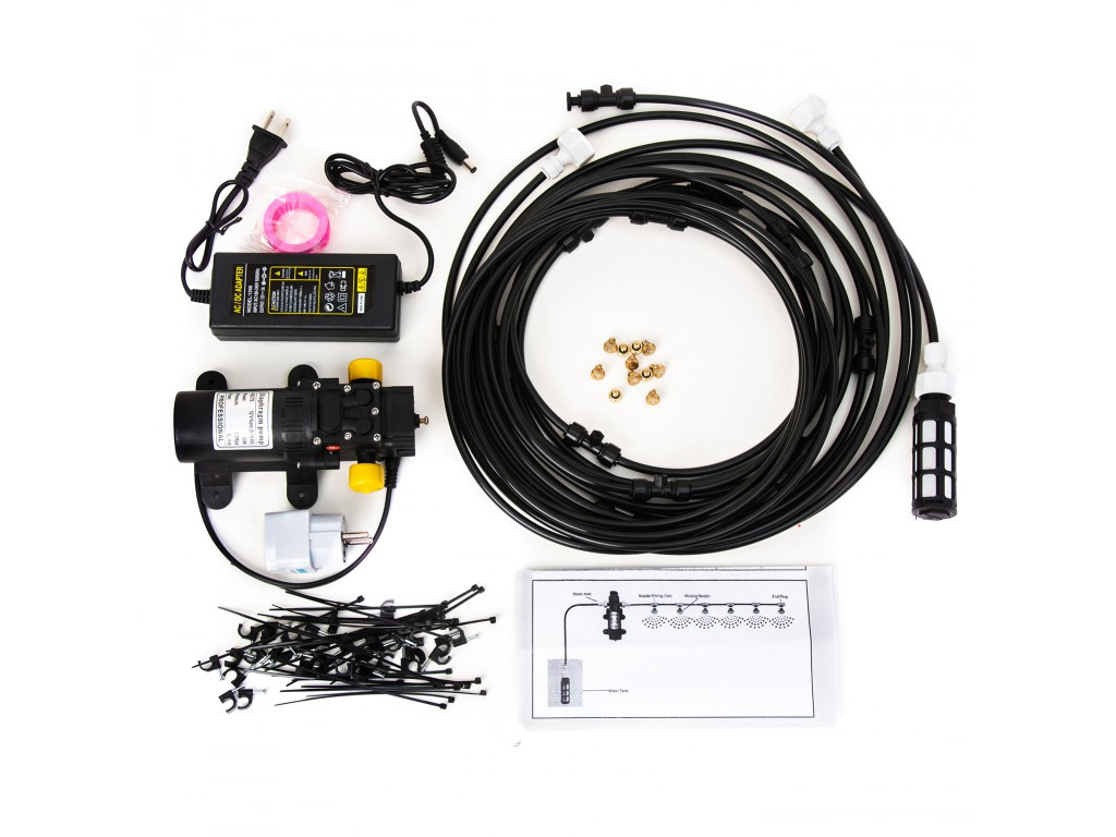 Комплект містить: кріплення та стяжки, фум. стрічка, магістральна шланга, форсунки адаптер живлення, електронасос, блок живлення, перехідник на європейську розетку.